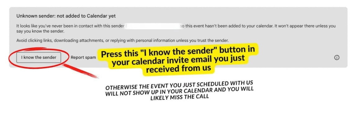 To add the event to your calendar you need to go to your email, and open ‘Invitation from an unknown sender" from a @sunnylenarduzzi.com domain, and click the "I Know The Sender" button